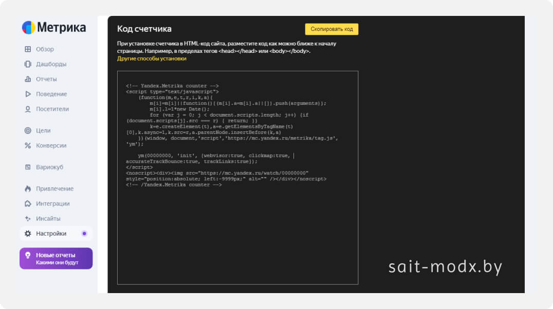 После этого система сгенерирует JavaScript-код счётчика. Именно его мы будем вставлять в MODX.