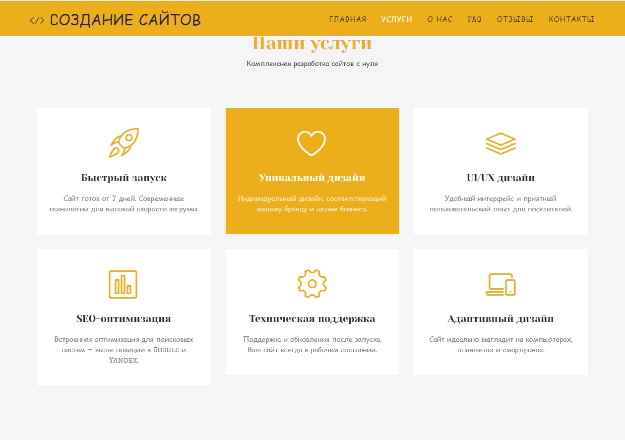 Это готовый шаблон одностраничного сайта. Вы получаете полностью собранную структуру, которую можно быстро адаптировать под свои услуги.