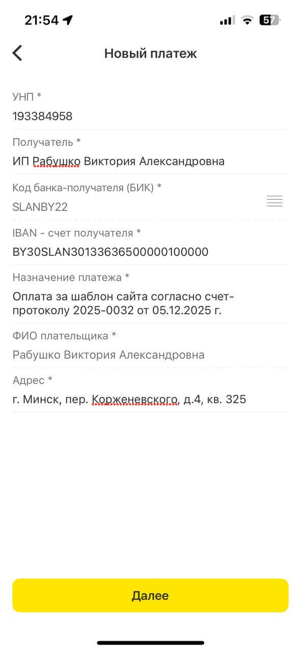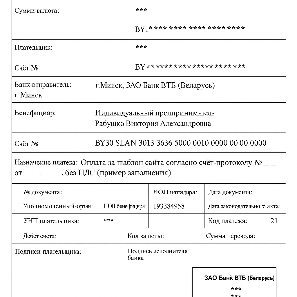 Ниже — подробная инструкция, как оплатить ваш заказ на расчётный счёт: через интернет-банк, мобильное приложение или в отделении банка. После оплаты мы проверим платеж и отправим письмо со ссылкой на архив шаблона на указанный вами e-mail.
